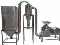 主要用途: 本机适用于制药,化工,食品,磁性材料,粉体等行业,是粉碎,吸尘及连续出料为一体的新一代粉碎设备。 工作原理: 本机由粉碎机,旋风分离器,脉冲除尘箱及风机等几大部分组成。该机是利用活动齿盘和固定齿盘间的相对运动,使被粉碎物料经齿冲击,摩擦及物料彼此间的冲击而获得粉碎,粉碎好的物料经旋转离心机和风机的引力,进入旋风分离器出料,然后经关风机,粉尘进入脉冲除尘箱,通过过滤筒和回收,粉碎细度用筛网调节。整机按GMP标准设计,全部用不锈钢材料制作,生产过程中无粉尘飞扬。 该粉碎机组是由大型万能粉碎机的机头,加设旋风出料器,除尘箱,以及风机组成,主要功能是,下料时候为静态出料,完全无风力存在,对于易于扬尘的物料有很好的作用,而尾部风机的巨大负压,一是加快了机头部分的快速出料,二是对于有沾网的物料,使其受力出料,三是加快了机头机腔的空气循环,防止机腔内部温度升高,相当于风冷却,这对于热敏性物料有利,同时该设备还有水循环冷却装置。
